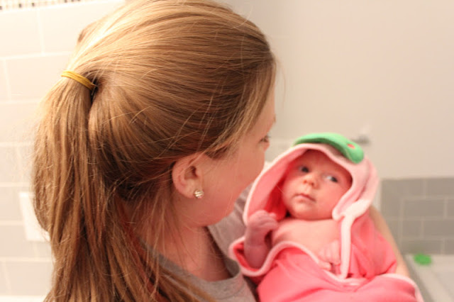 Sleeping: You are a sleeping champion! We are continually amazed (and are keeping our fingers crossed) because you sleep so well. This month, we started a bedtime routine with you. First we give you a bath around 7:30pm, and then I feed you, and then I put you down. You don't always fall asleep right away, but usually you're in your crib asleep by 9:30pm or so, give or take an hour. And then...here's the best part...you sleep until anywhere between 6:30am to 9:30am! In the beginning of this month, it was closer to 6:30am, and then I would feed you and you'd go back to sleep for a few hours. As you got closer to two months old, you started sleeping through that early morning feeding and often wake up between about 8am and 9am. Thank you, little girl! Mommy sure does appreciate all of the sleep she's able to get!
